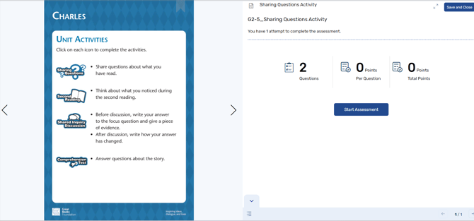 In Unit Activities, you can start an assessment to answer questions about the story. It is important that you remember to click the Submit button and the Save and Close button for your work to be saved.
