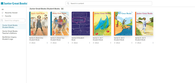 Upon logging in, you will see a list of the books purchased. On the left-hand side, there is a column with a filter feature, allowing you to sort your books by categories, such as student books or nonfiction logs. Additionally, you have an option to view All books, Recently Viewed books, or Favorites.