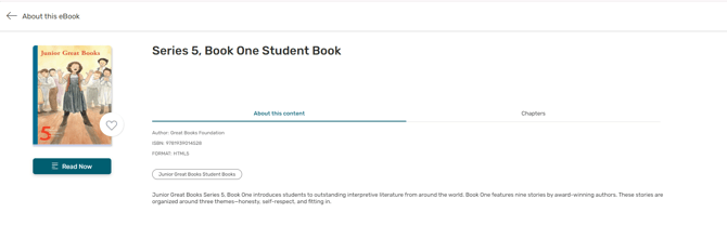 Under each book, there are three dots. Clicking on these dots will provide more information about the book, including details about its content and a breakdown of the chapters. You can click the heart icon to add the book to your Favorites or select Read Now"to open the book.